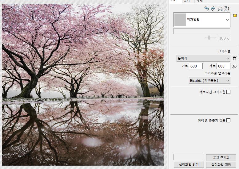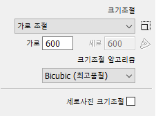 만약, 가로 이미지는 800px로 맞추고 싶지만 세로 이미지는 가로 폭을 600px로 더 줄여서 조절하고 싶을때는 어떻게 해야할까요? 아래와 같이 세로사진 크기조절에 체크하고 가로 조절에 값은 600으로 설정하면 됩니다.