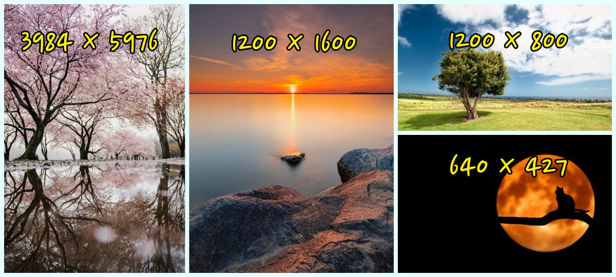 2개의 portrait와 2개의 landscape 이미지를 사용하며, 변환 과정 설명을 위해서 다양한 크기의 사진을 사용하였습니다.