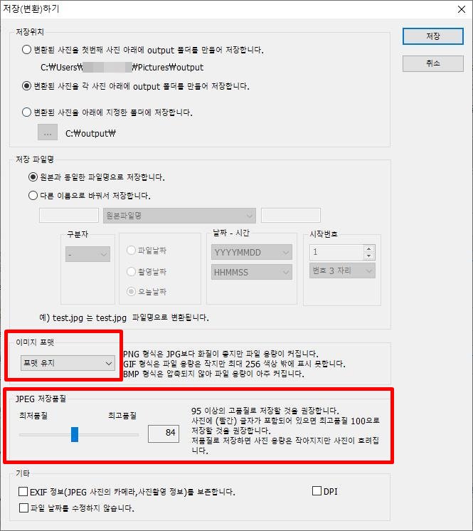 다만, 한가지만 추가 설명하자면, 이미지를 원본 이미지의 포맷으로 유지할 수 도 있고 아니면 PNG, JPG 등 원하는 포맷으로 변환하여 저장할 수도 있습니다. 만약 JPEG으로 변환한다면 품질에 대해서도 일괄 조절하도록 설정할 수 있습니다.