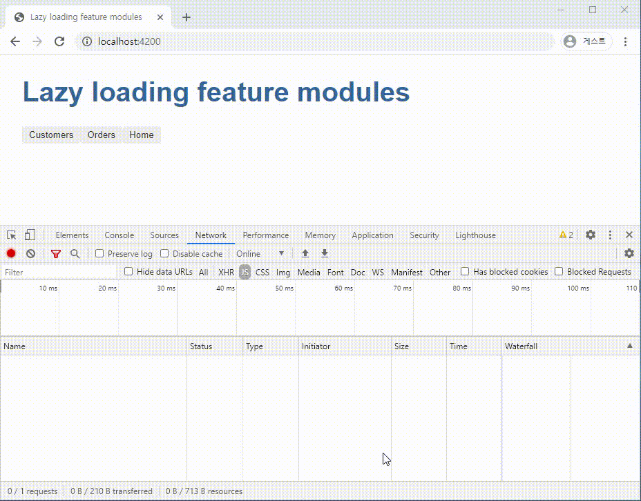 아래 그림은 앵귤러에서의 Lazy Loading에 대한 예제입니다. 최초의 페이지 (Home) 로드 후 "/orders", "/customers"로 이동하게 되면 해당 라우팅 페이지에 해당하는 파일 조각을 서버에 요청하여 받아오게 됩니다. 즉, 초기 로드 시에는 Root와 Home에 대한 code만 보유하고 있고 라우팅에 따라서 순차적으로 필요한 리소스를 로드를 하게 됩니다.