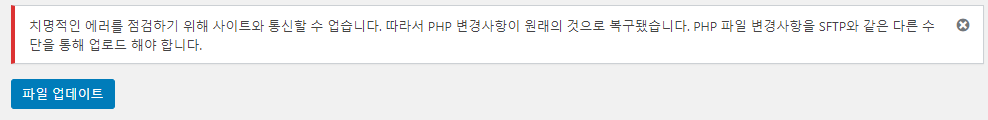 "치명적인 에러를 점검하기 위해 사이트와 통신할 수 업습니다. 따라서 PHP 변경사항이 원래의 것으로 복구됐습니다. PHP 파일 변경사항을 SFTP와 같은 다른 수단을 통해 업로드해야 합니다."